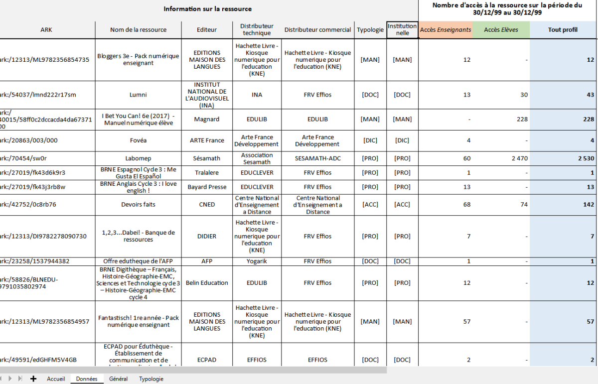 La DRANE Site de Lyon vous propose un fichier à compléter avec les données de votre établissement pour obtenir le top 10 des ressources les plus utilisées, par profil d'utilisateurs.