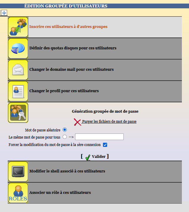 Supprimer l'utilisateur : efface l'utilisateur ET propose de supprimer son répertoire personnel ainsi que son responsable associé : à utiliser avec prudence. Si vous choisissez de conserver les données de l'utilisateur, elles seront déplacées dans /home/recyclage/.